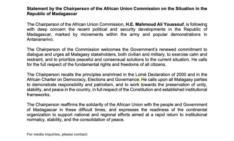 ሊቀመንበሩ በእነዚህ አስቸጋሪ ጊዜያት የአፍሪካ ህብረት ከማዳጋስካር ህዝብና መንግስት ጋር ያለውን አጋርነት ያረጋገጡ ሲሆን አህጉራዊ ድርጅቱ ወደ ተቋማዊ መደበኛነት፣ መረጋጋት እና ሰላም መጠናከር ፈጣን ሀገራዊ እና ክልላዊ ጥረቶችን ለመደገፍ ያለውን ዝግጁነት ገልጿል።
