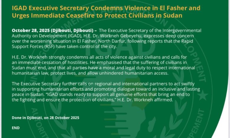ኢጋድ በኤልፋሸር የተከሰተውን ሁከት አወገዘ።