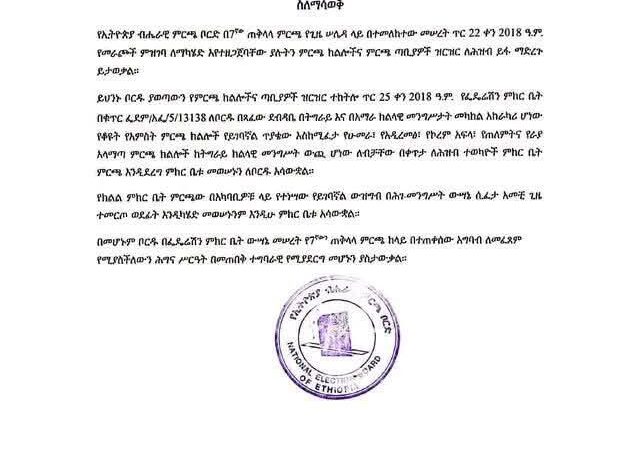 ኢትዮ ሞኒተር፡ 16/06/2018፡- የፌዴሬሽን ምክር ቤት በአማራ እና በትግራይ ክልሎች መካከል አከራካሪ በሆኑ ቦታዎች “ከትግራይ ክልላዊ መንግሥት ውጪ ሆነው ለብቻቸው” በቀጥታ ለሕዝብ ተወካዮች ምከር ቤት ምርጫ እንዲደረግ መወሰኑን የኢትዮጵያ ብሔራዊ ምርጫ ቦርድ አስታወቀ።